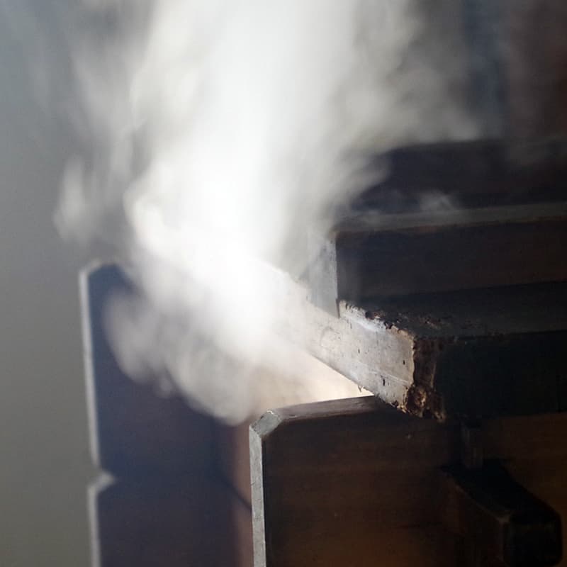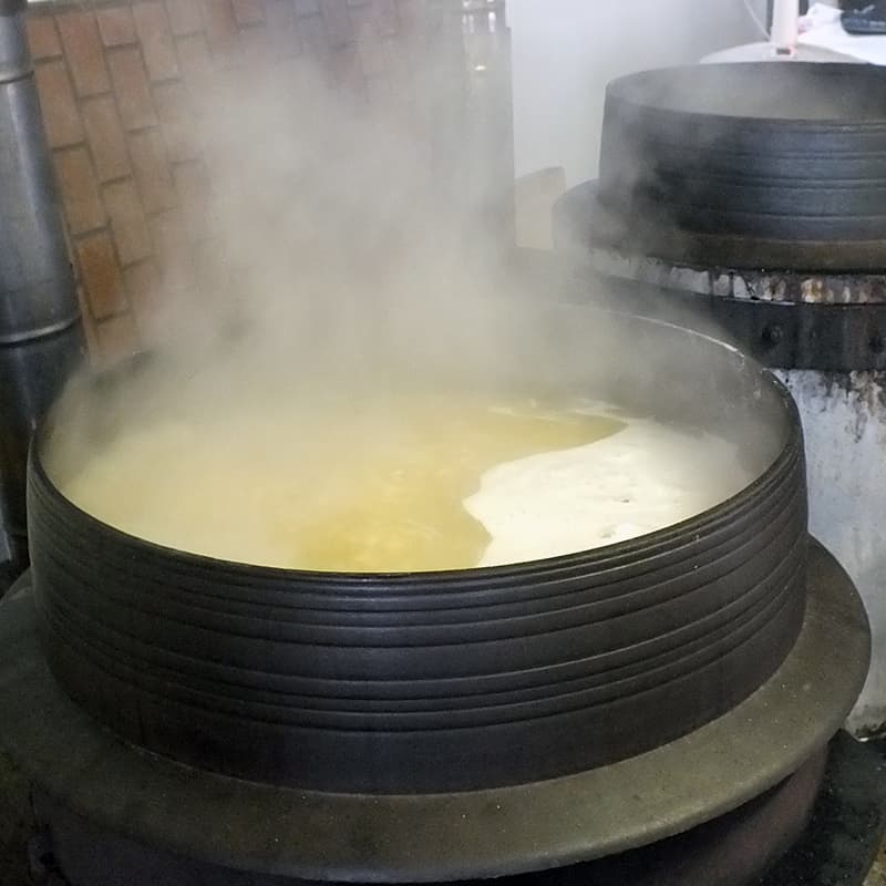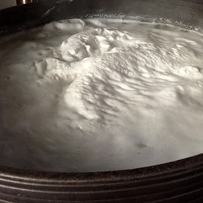 大豆を味噌仕込みに適した柔らかさまで煮る。沸騰してから役10時間は薪を燃やし続けさらにアクを取り続ける。画面のホイップクリーム状のモノが大豆のアク。