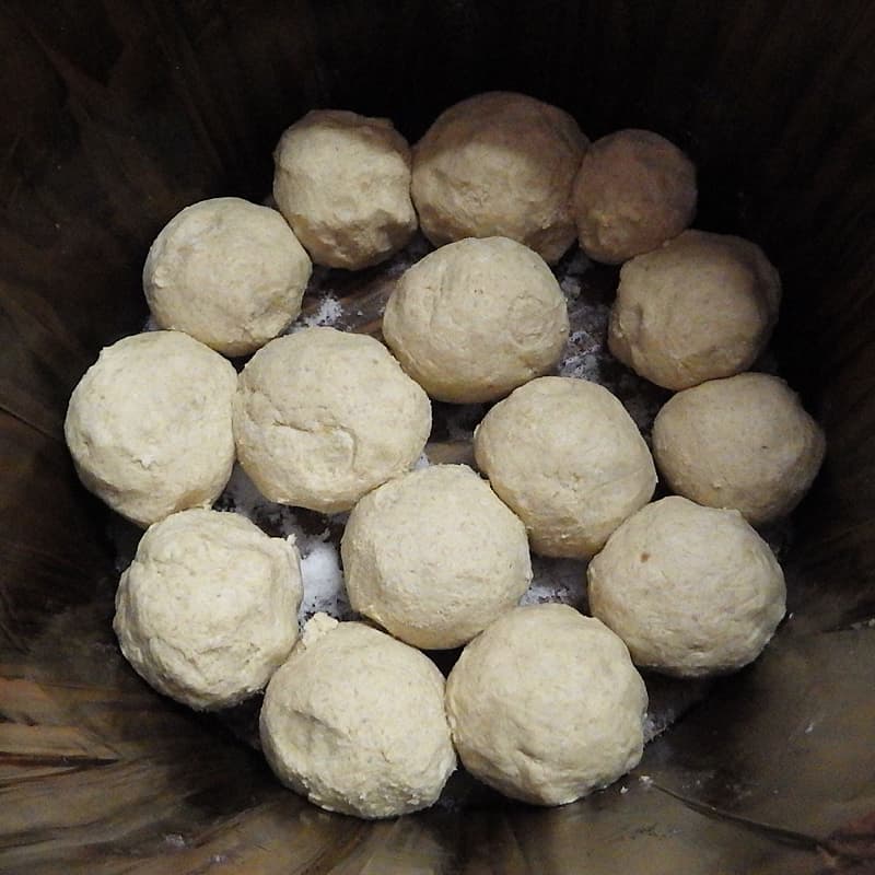 ペースト状の大豆が冷めたら米麹、天然塩、大豆の煮汁を混ぜ合わせてからボール状に空気を抜きながら丸め熱湯消毒した杉樽に詰めていく。