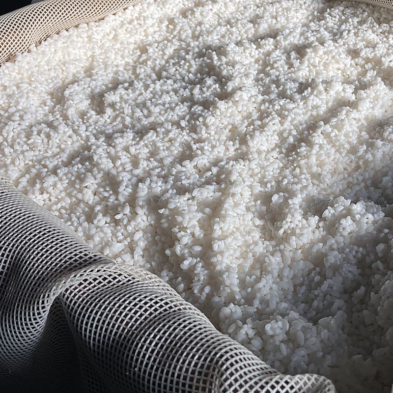 米は糠を完全に取り切るまで研ぎ上げ一晩水に浸けて吸水させ蒸籠にかける前に時間をかけて水を切る。