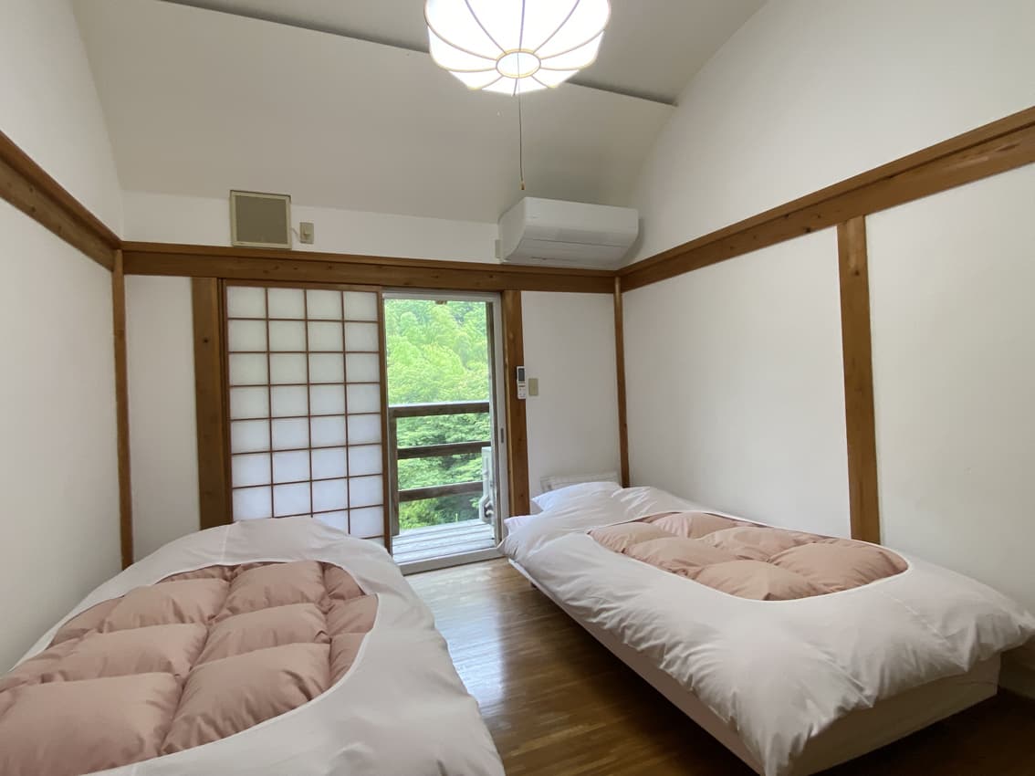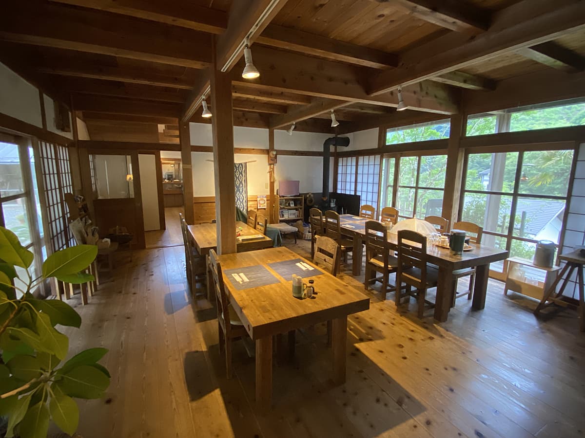 夏はこの部屋の両側が窓が開き網戸になるので風が抜け扇風機だけで過ごせます。冬は薪ストーブがあるので快適な暖かさで過ごせます。