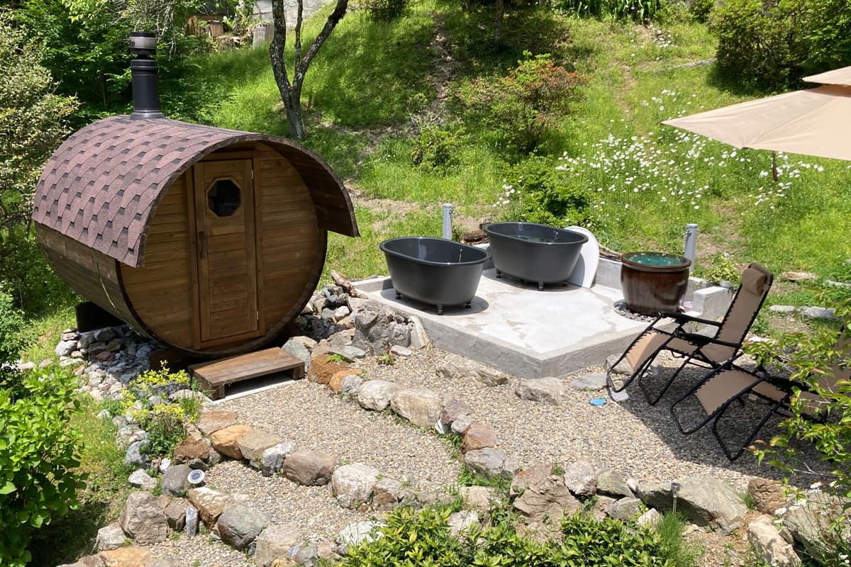 西山荘 笑美亭のバレルサウナは時間制の貸切りです。他の方とのバッティングがないので自分たちのペースでドライサウナ&ロウリュウ&水風呂&外気浴をお楽しみいただけます。