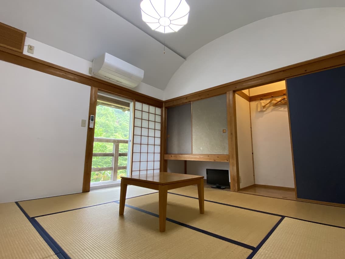 夏はこの部屋の両側が窓が開き網戸になるので風が抜け扇風機だけで過ごせます。冬は薪ストーブがあるので快適な暖かさで過ごせます。